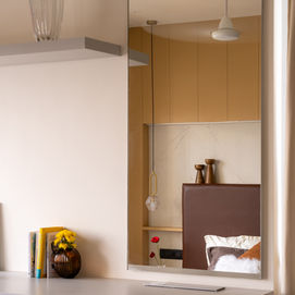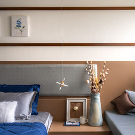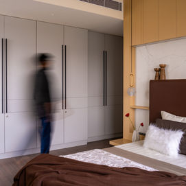We responded by designing interior units with built-in lighting that acted as ambient light sources, softly washing the spaces with a gentle glow. Statement lighting fixtures were also carefully curated and styled across the apartment to create focal points and highlight select corners. A mild pastel colour palette was chosen to complement the mood lighting—beiges, sandals, fawn tones, sage greens, and powder blues were layered thoughtfully across the apartment’s surfaces. These hues work well under warm lights, creating a calm, mellow, yet luxurious atmosphere.